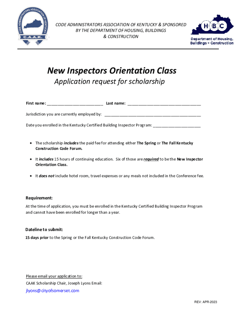 CODE ADMINISTRATORS ASSOCIATION OF KENTUCKY & SPONSOREDBY THE DEPARTMENT OF HOUSING, BUILDINGS& CONSTRUCTIONNew Inspectors Orientation ClassApplication request for scholarshipFirst name: ___ Last