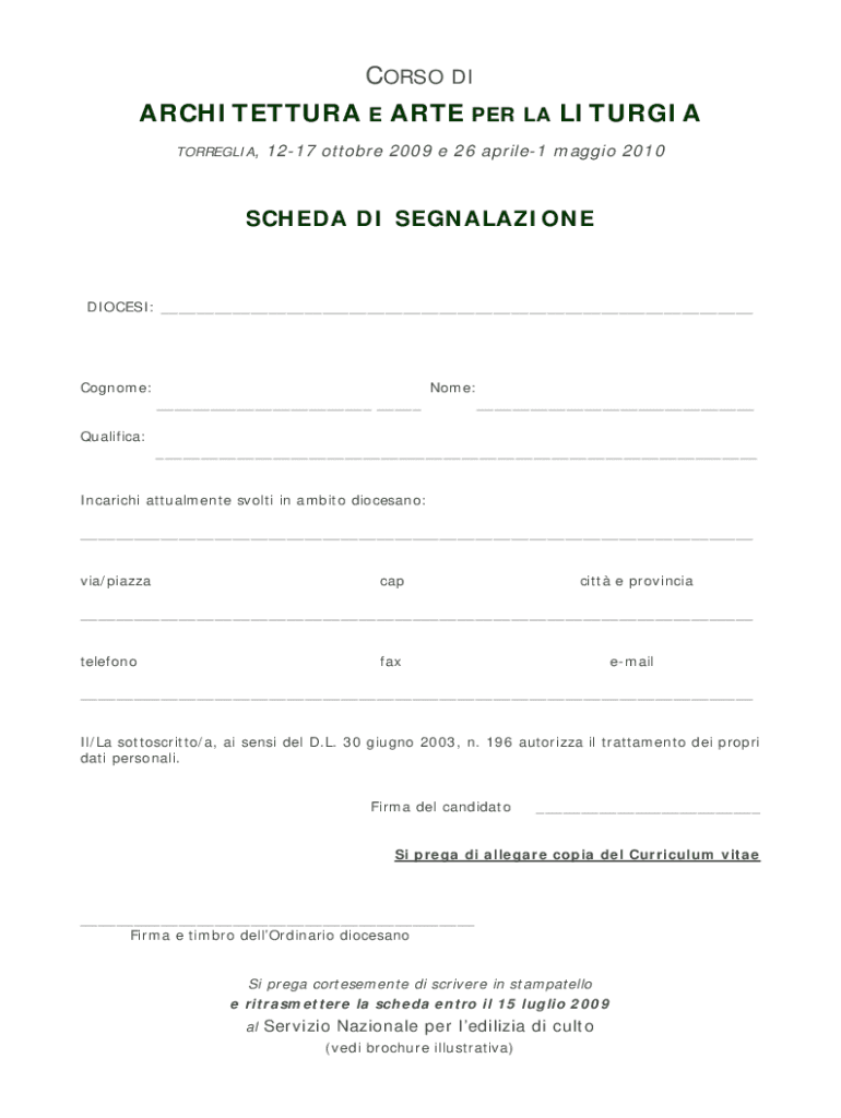 CORSO DI ARCHITETTURA E ARTE PER LA LITURGIA TORREGLIA,1217 ottobre 2009 e 26 aprile1 maggio 2010SCHEDA DI SEGNALAZIONEDIOCESI: ___Cognome: Qualifica:___ ___Nome: ______Incarichi attualmente svolti