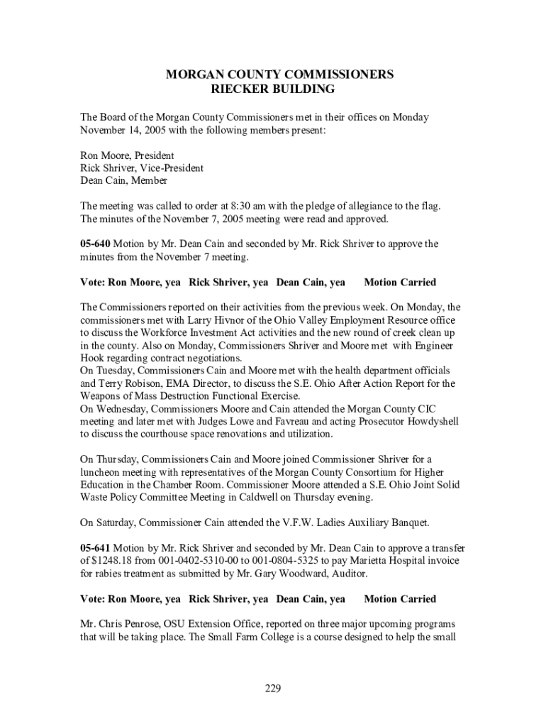 MORGAN COUNTY COMMISSIONERS RIECKER BUILDING The Board of the Morgan County Commissioners met in their offices on Monday November 14, 2005 with the following members present: Ron Moore, President