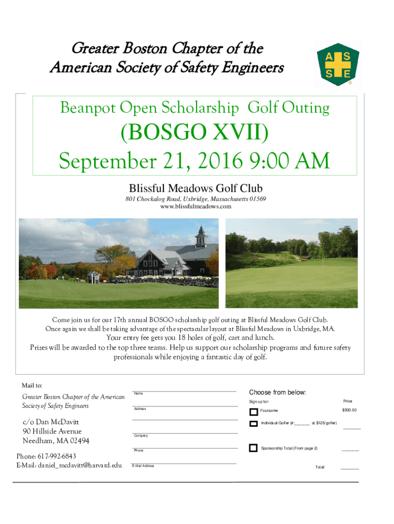 Greater Boston Chapter of the American Society of Safety EngineersBeanpot Open Scholarship Golf Outing(BOSGO XVII) September 21, 2016 9:00 AM Blissful Meadows Golf Club 801 Chockalog Road, Uxbridge,
