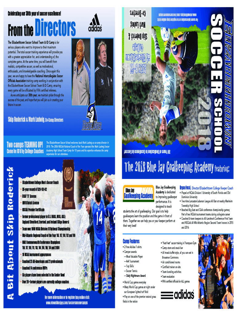 Celebrating our 30th year of soccer excellence!From the DirectorsFor more information or to register/pay online visit: www.etownbluejays.com/soccersummercampsThe Elizabethtown Soccer School Team &