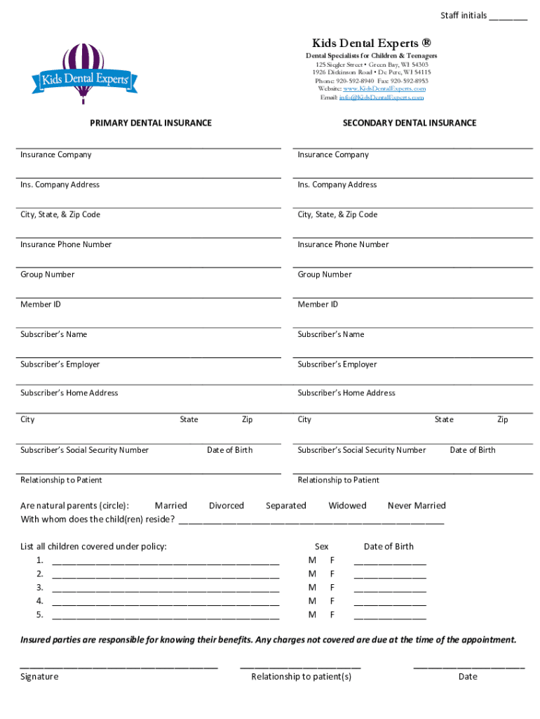 Staff initials ___Kids Dental Experts Dental Specialists for Children & Teenagers 125 Siegler Street Green Bay, WI 54303 1926 Dickinson Road De Pere, WI 54115 Phone: 9205928940 Fax: 9205928953 Website: