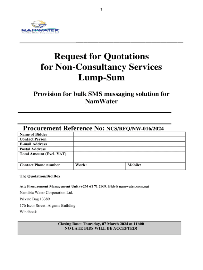 1___Request for Quotations for NonConsultancy Services LumpSum Provision for bulk SMS messaging solution for NamWaterProcurement Reference No: NCS/RFQ/NW016/2024 Name of Bidder Contact Person Email