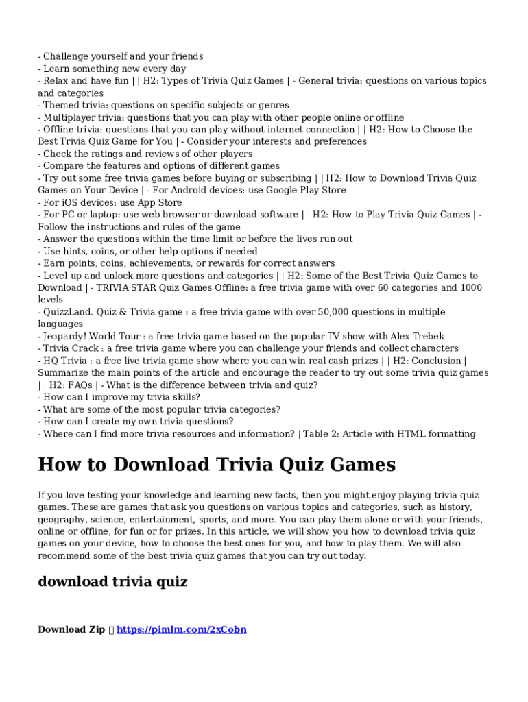 Relax and have fun | | H2: Types of Trivia Quiz Games | General trivia: questions on various topics