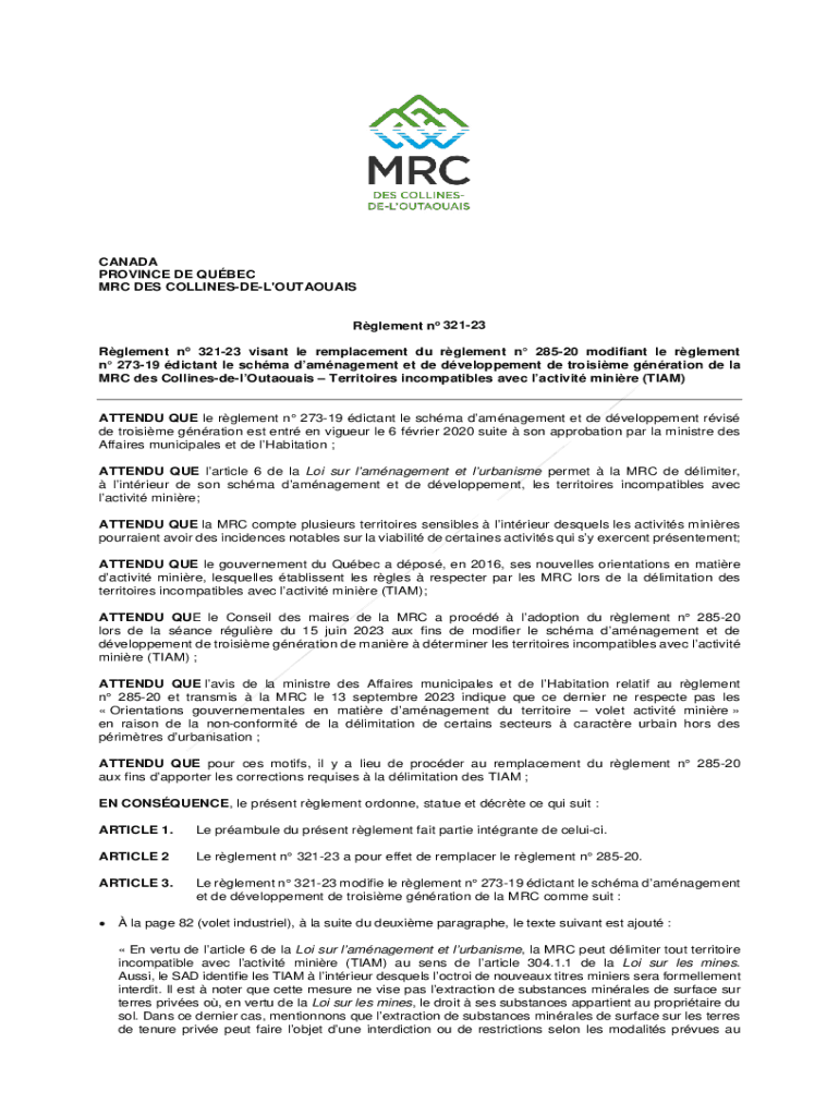 CANADA PROVINCE DE QUBEC MRC DES COLLINESDEL\'OUTAOUAIS Rglement no 32123 Rglement no 32123 visant le remplacement du rglement n 28520 modifiant le rglement n 27319 dictant le schma damnagement et