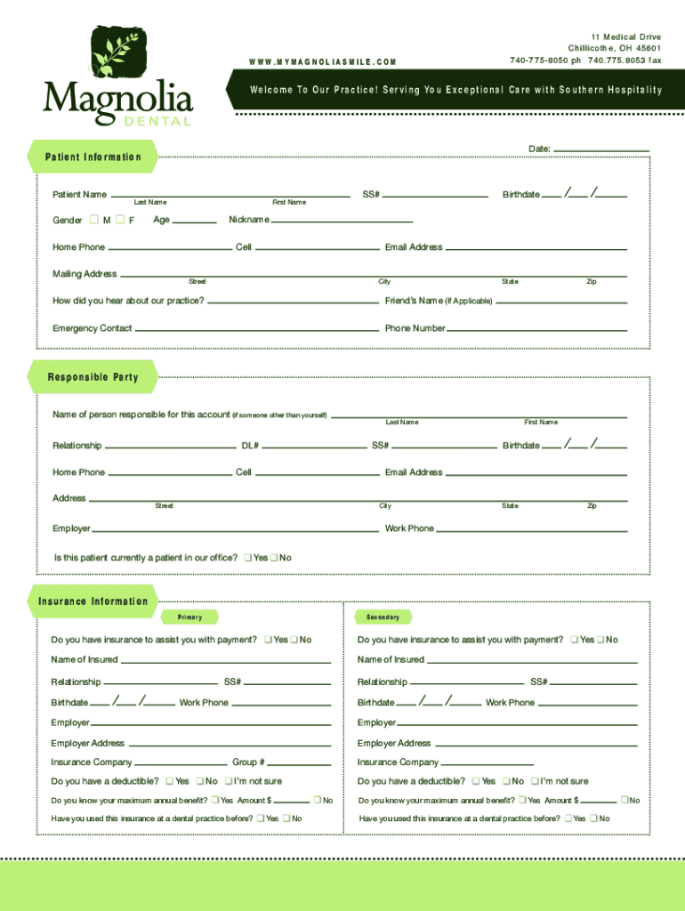 11 M e d i c a l D r i v e Chillicothe, OH 45601 7407758050 p h 7 4 0 . 7 7 5 . 8 0 5 3 f a xWWW.MYMAGNOLIASMILE.COMW e l c o m e To O u r P r a c t i c e ! S e r v i n g Yo u E x c e p t i o n a