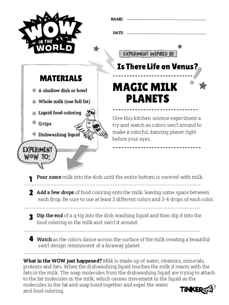 NAME: DATE:Is There Life on Venus?MATERIALS A shallow dish or bowl Whole milk (use full fat) Liquid food coloring Qtips Dishwashing liquidMAGIC MILK PLANETSGive this kitchen science experiment a try