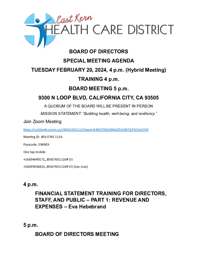BOARD OF DIRECTORS SPECIAL MEETING AGENDA TUESDAY FEBRUARY 20, 2024, 4 p.m. (Hybrid Meeting) TRAINING 4 p.m. BOARD MEETING 5 p.m. 9300 N LOOP BLVD, CALIFORNIA CITY, CA 93505 A QUORUM OF THE BOARD