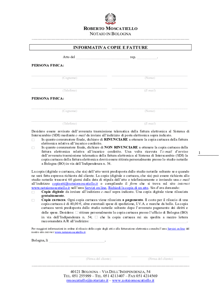 ROBERTO MOSCATIELLO NOTAIO IN BOLOGNA___INFORMATIVA COPIE E FATTURE Atto del ___ rep. ___. PERSONA FISICA:____________(Cognome)(Telefono)(Nome)(Email)PERSONA FISICA:____________(Cognome)(Telefono)(Nome)(Email)Desidero