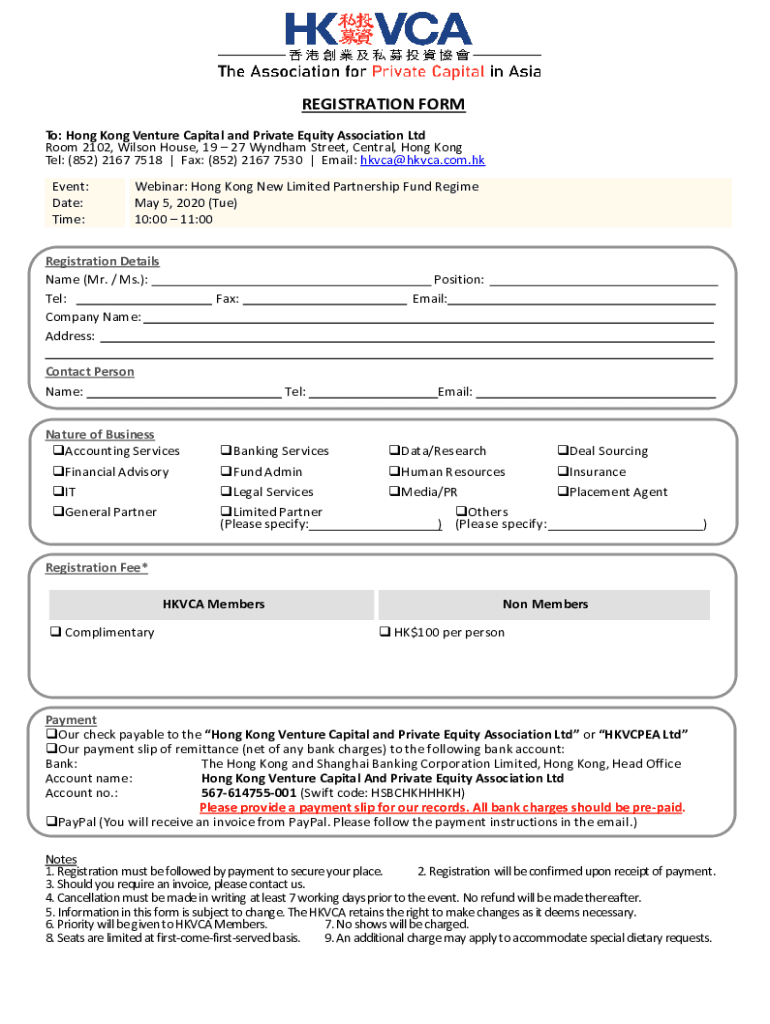 REGISTRATION FORM To: Hong Kong Venture Capital and Private Equity Association Ltd Room 2102, Wilson House, 19 27 Wyndham Street, Central, Hong Kong Tel: (852) 2167 7518 | Fax: (852) 2167 7530 | Email: