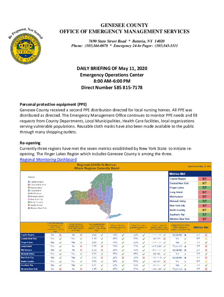 GENESEE COUNTY OFFICE OF EMERGENCY MANAGEMENT SERVICES 7690 State Street Road * Batavia, NY 14020 Phone: (585)3440078 * Emergency 24hr Pager: (585)3433311DAILY BRIEFING OF May 11, 2020 Emergency Operations