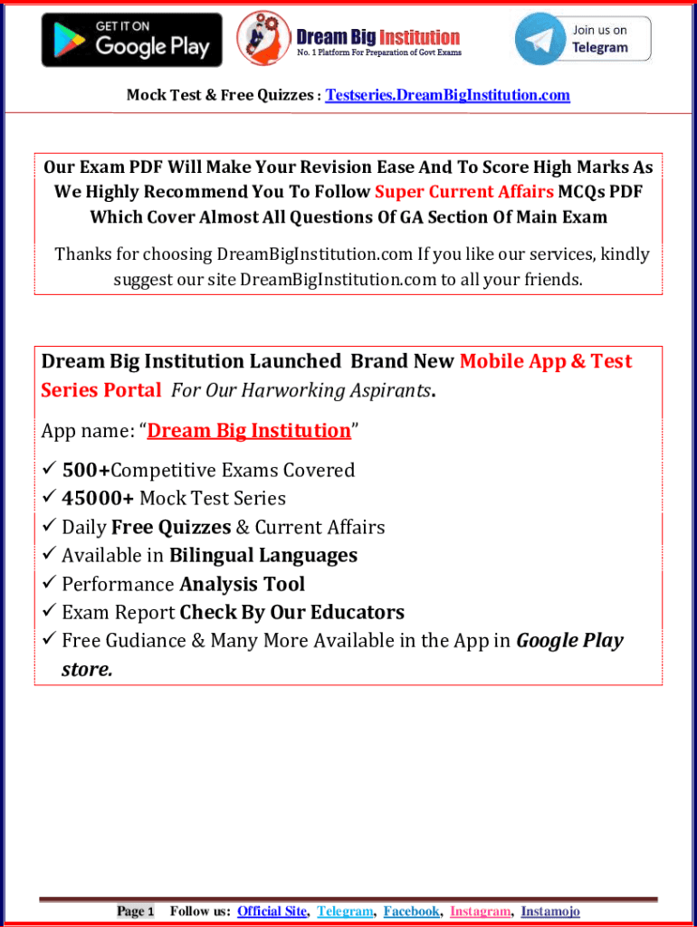Mock Test & Free Quizzes : Testseries.DreamBigInstitution.comOur Exam PDF Will Make Your Revision Ease And To Score High Marks As We Highly Recommend You To Follow Super Current Affairs MCQs PDF Which