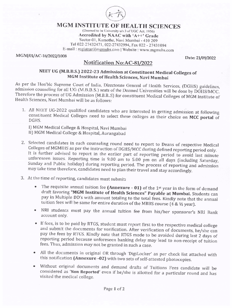 Annexure 01Annexure 02 MGM INSTITUTE OF HEALTH SCIENCES Checklist for Documents Submission (First First Year M.B.B.S. 202223) 20 No. Acad.16/2022Date://2022Name of the Candidate: Mr. /Ms. Ms. ___