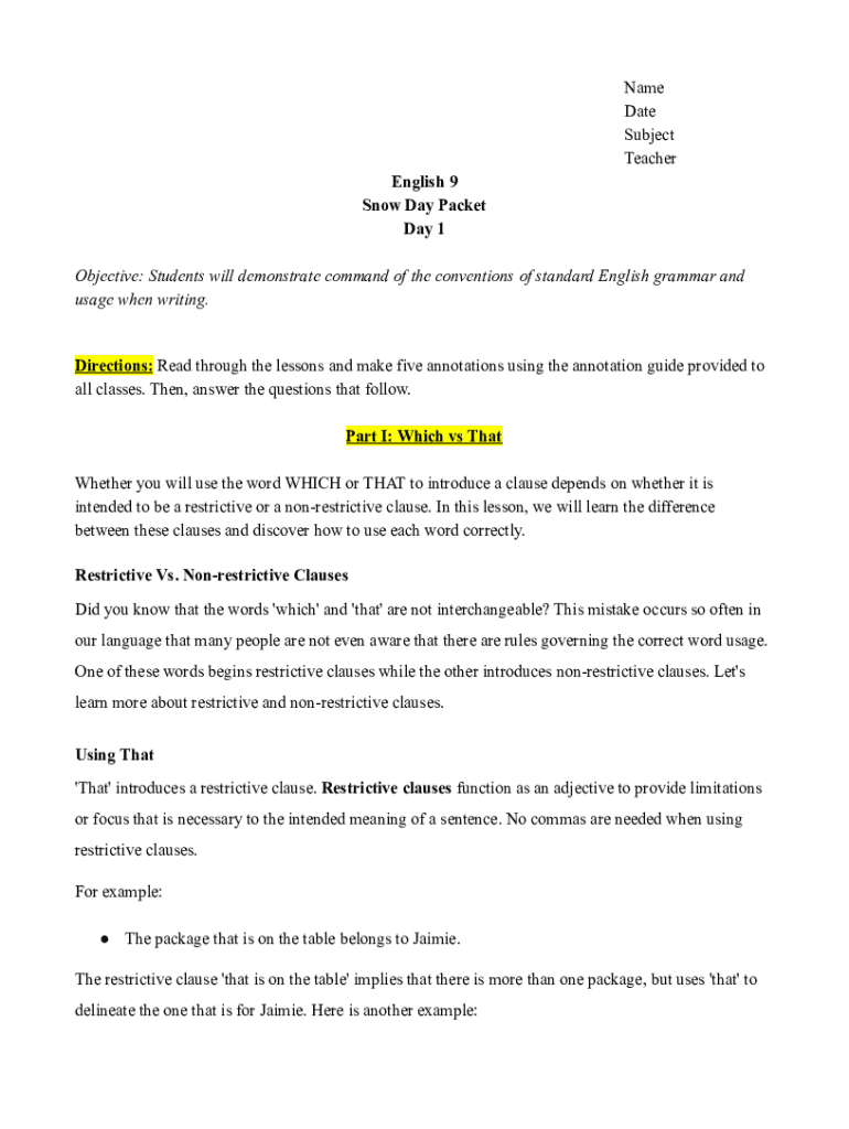 Get the free Name Date Subject Teacher English 9 Snow Day Packet ...