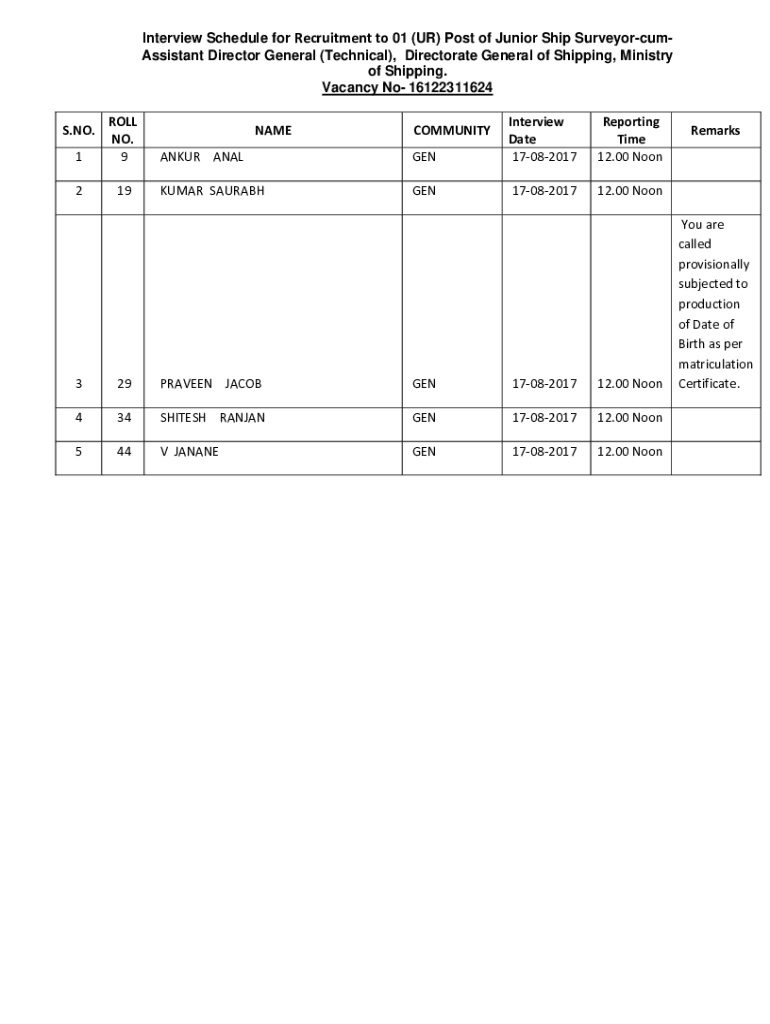 Interview Schedule for Recruitmentto01 (UR) Post of Junior Ship SurveyorcumAssistant Director General (Technical), Directorate General of Shipping, Ministry