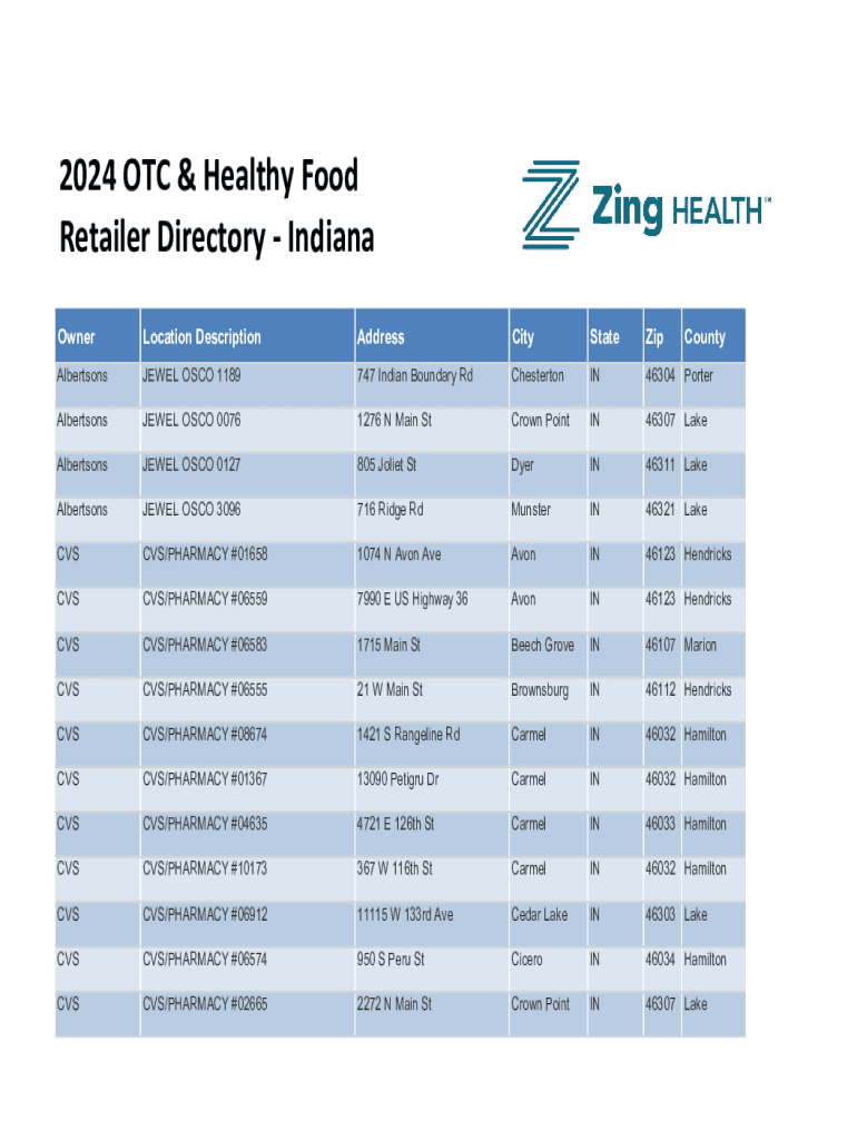 2024 OTC & Healthy Food Retailer Directory Indiana OwnerLocation DescriptionAddressCityStateZipCountyAlbertsonsJEWEL OSCO 1189747 Indian Boundary RdChestertonIN46304 PorterAlbertsonsJEWEL OSCO 00761276