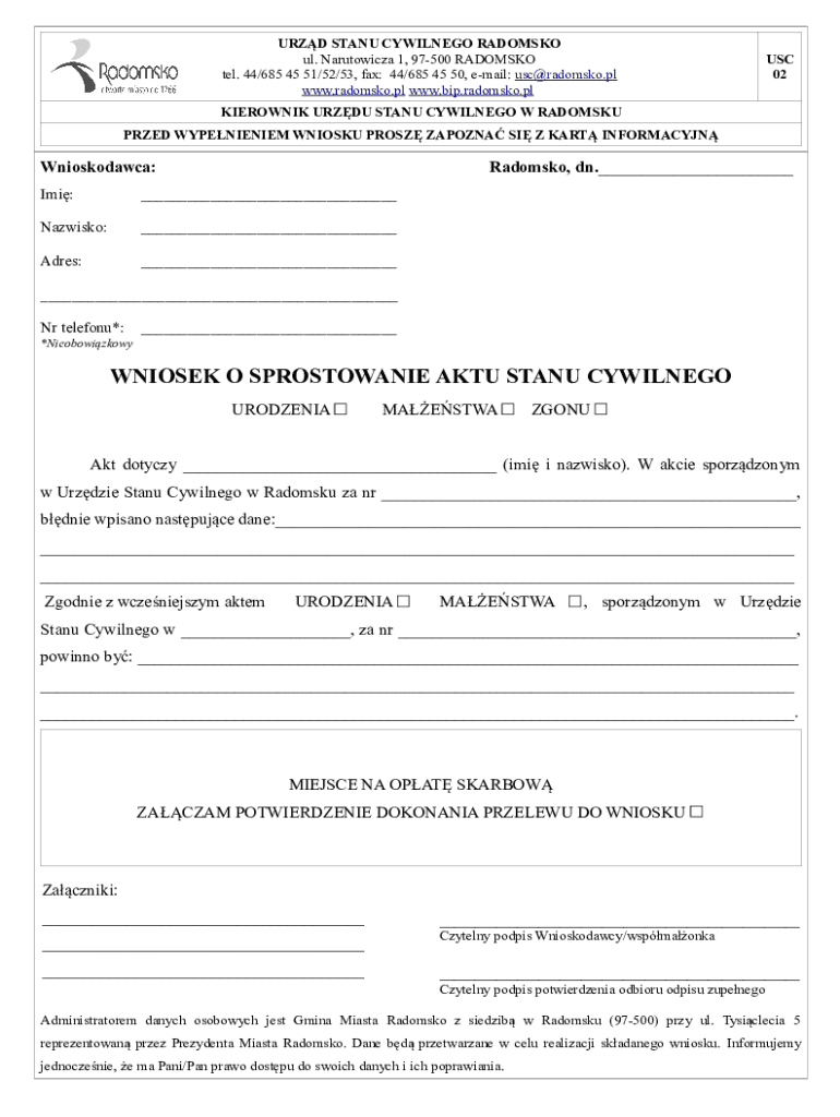 URZD STANU CYWILNEGO RADOMSKO ul. Narutowicza 1, 97500 RADOMSKO tel. 44/685 45 51/52/53, fax: 44/685 45 50, email: usc@radomsko.pl www.radomsko.pl www.bip.radomsko.plUSC 02KIEROWNIK URZDU STANU CYWILNEGO