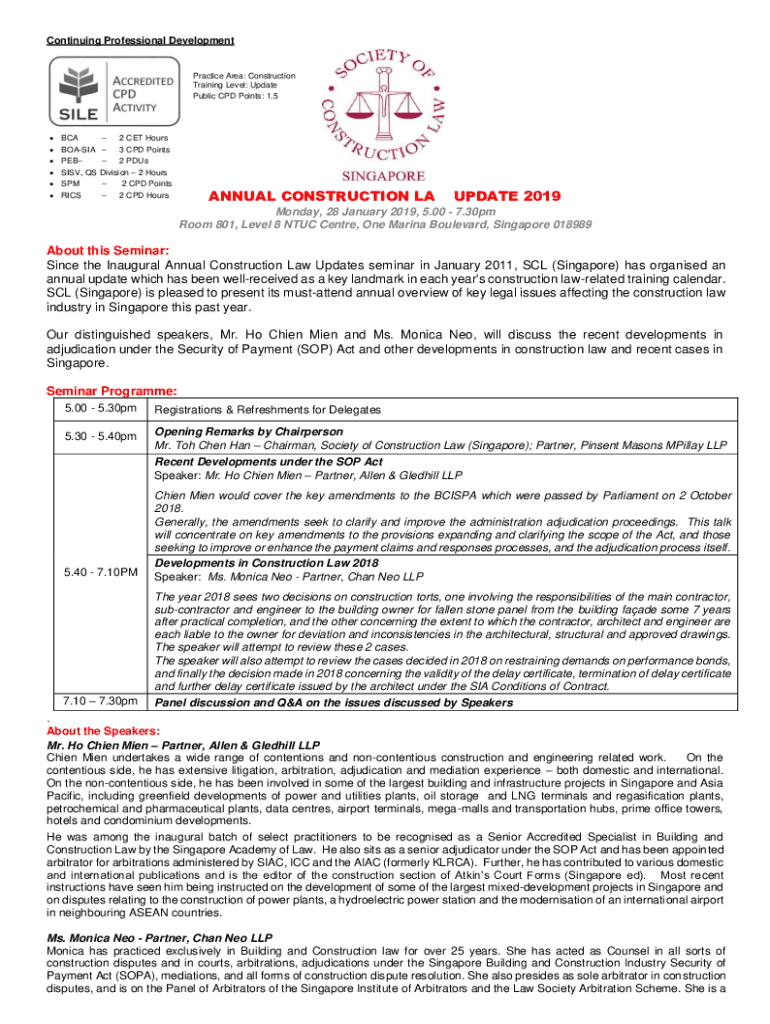 Continuing Professional DevelopmentPractice Area: Construction Training Level: Update Public CPD Points: 1.5 BCA 2 CET Hours BOASIA 3 CPD Points PEB 2 PDUs SISV, QS Division 2 Hours SPM 2 CPD Points