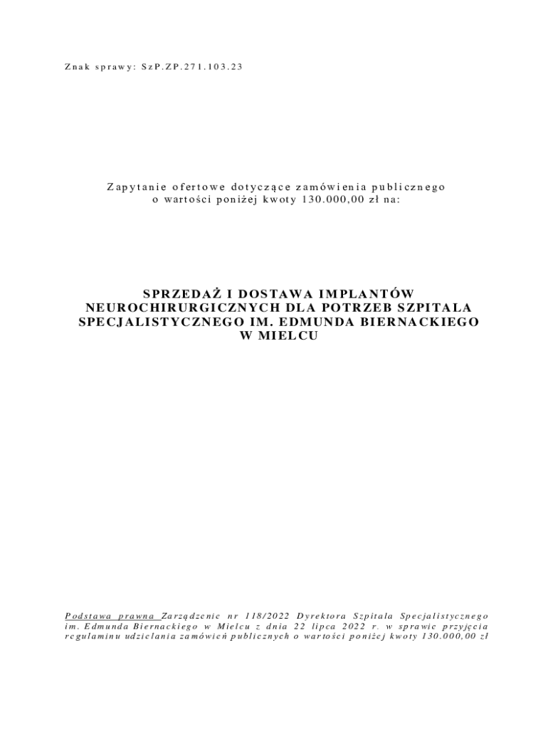 Znak sprawy: SzP.ZP.271.103.23Zapytanie ofertowe dotyczce zamwienia publicznego o wartoci poniej kwoty 130.000,00 z na:S P R ZE D A I DO S T AW A I M PL A N T W N E U RO CH I RUR G I C ZN Y C H DL