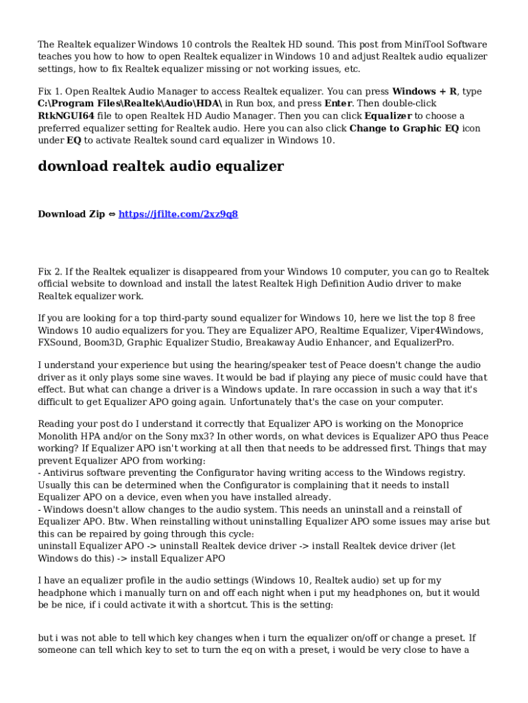 The Realtek equalizer Windows 10 controls the Realtek HD sound. This post from MiniTool Software teaches you how to how to open Realtek equalizer in Windows 10 and adjust Realtek audio equalizer settings,