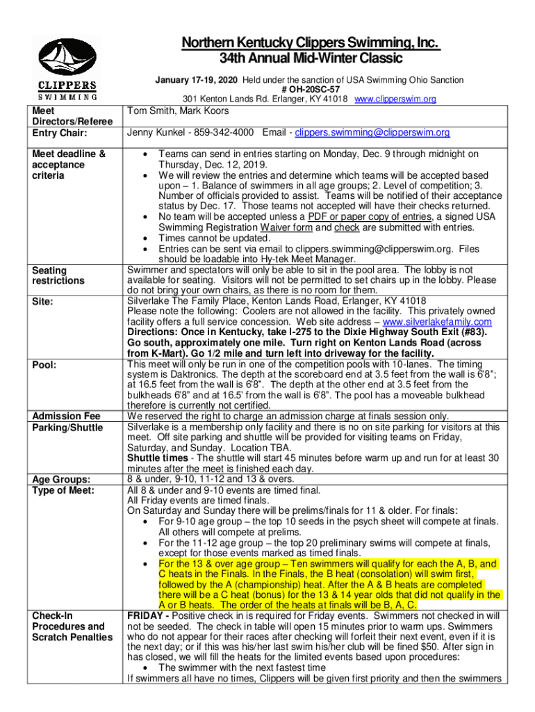 Northern Kentucky Clippers Swimming, Inc. 34th Annual MidWinter Classic January 1719, 2020 Held under the sanction of USA Swimming Ohio Sanction # OH20SC57 301 Kenton Lands Rd. Erlanger, KY 41018