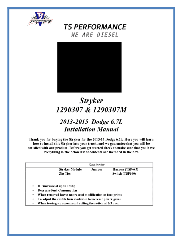 TSPERFORMANCE WE ARE DIESELStryker 1290307 & 1290307M 20132015 Dodge 6.7L Installation Manual Thank you for buying the Stryker for the 201315 Dodge 6.7L. Here you will learn how to install this Stryker