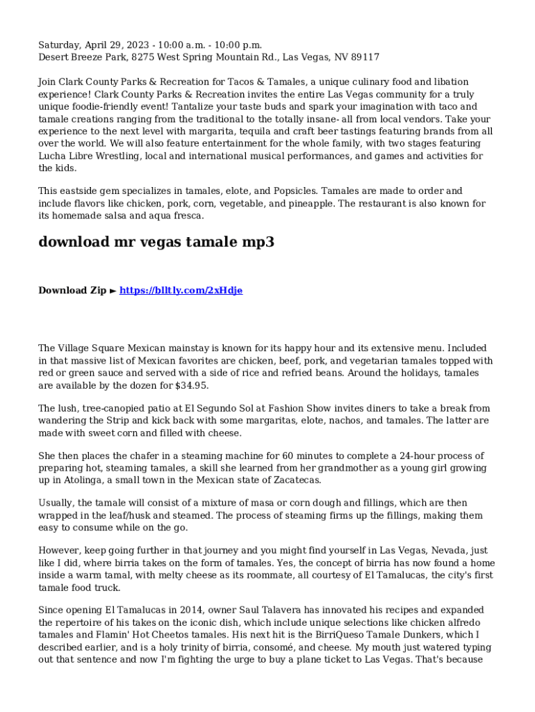 Saturday, April 29, 2023 10:00 a.m. 10:00 p.m. Desert Breeze Park, 8275 West Spring Mountain Rd., Las Vegas, NV 89117 Join Clark County Parks & Recreation for Tacos & Tamales, a unique culinary food