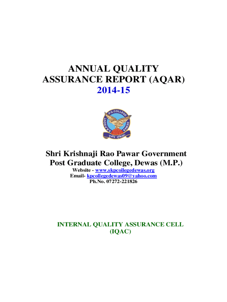 ANNUAL QUALITY ASSURANCE REPORT (AQAR) 201415Shri Krishnaji Rao Pawar Government Post Graduate College, Dewas (M.P.) Website www.skpcollegedewas.org Email kpcollegedewas09@yahoo.com Ph.No. 07272221826INTERNAL