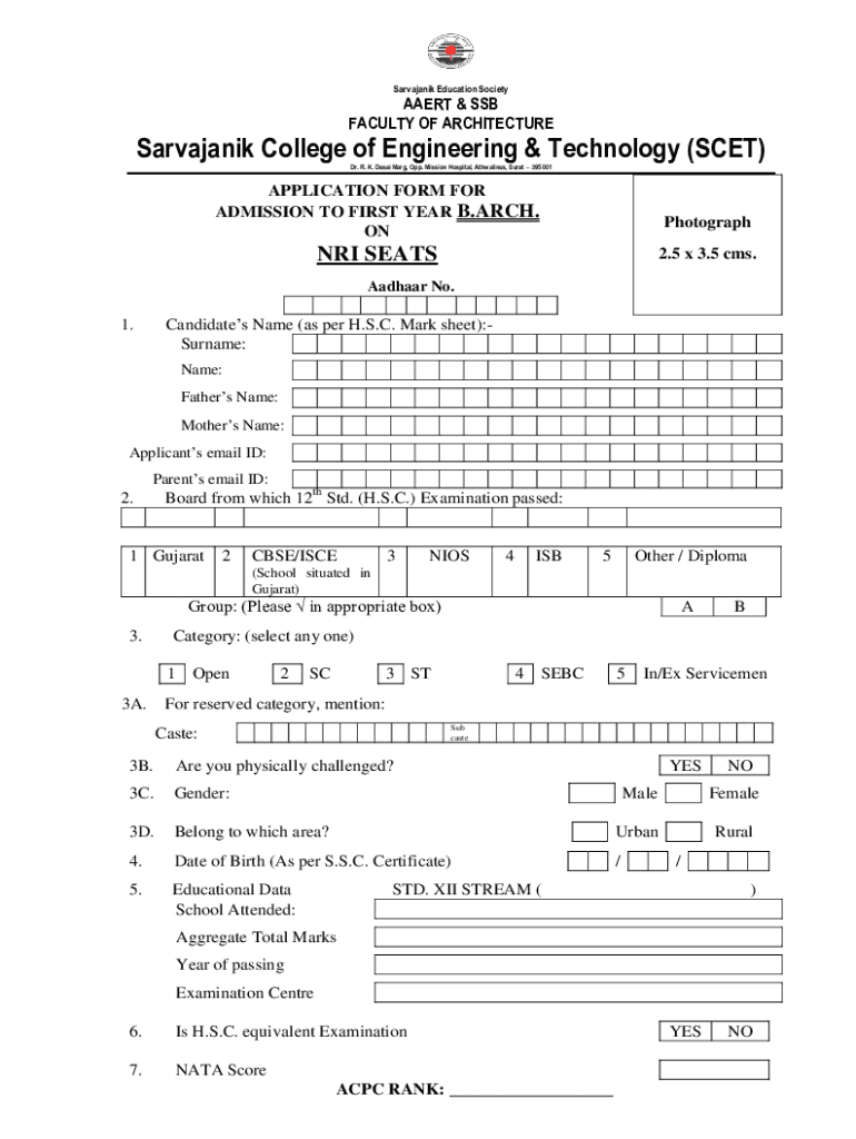 Sarvajanik Education SocietyAAERT & SSB FACULTY OF ARCHITECTURESarvajanik College of Engineering & Technology (SCET) Dr. R. K. Desai Marg, Opp. Mission Hospital, Athwalines, Surat 395 001APPLICATION