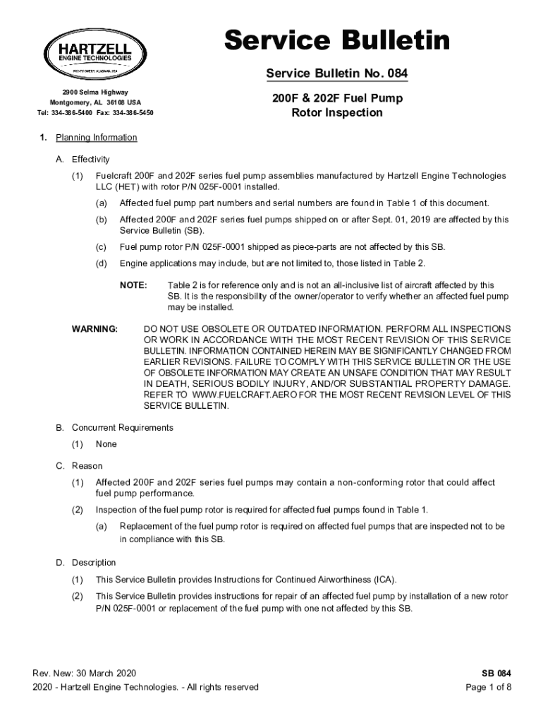 Service Bulletin Service Bulletin No. 084 2900 Selma Highway Montgomery, AL 36108 USA Tel: 3343865400 Fax: 3343865450200F & 202F Fuel Pump Rotor Inspection1.Planning Information A.Effectivity (1)Fuelcraft
