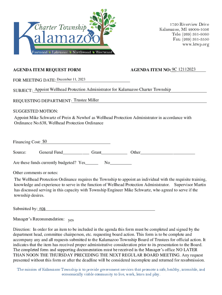 1720 Riverview Drive Kalamazoo, Michigan 49004 Tele: (269) 3818080 www.ktwp.orgBoard of Trustees Regular Meeting Agenda December 11, 2023 7:30 P.M. The Regular Meeting of the Board of Trustees of