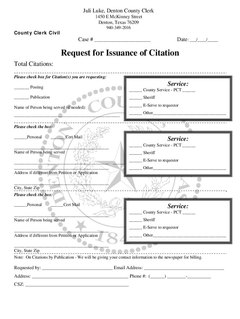 Juli Luke, Denton County Clerk 1450 E McKinney Street Denton, Texas 76209 9403492016County Clerk CivilCase # ___Date: ___/___/___Request for Issuance of Citation Total Citations: Please check box