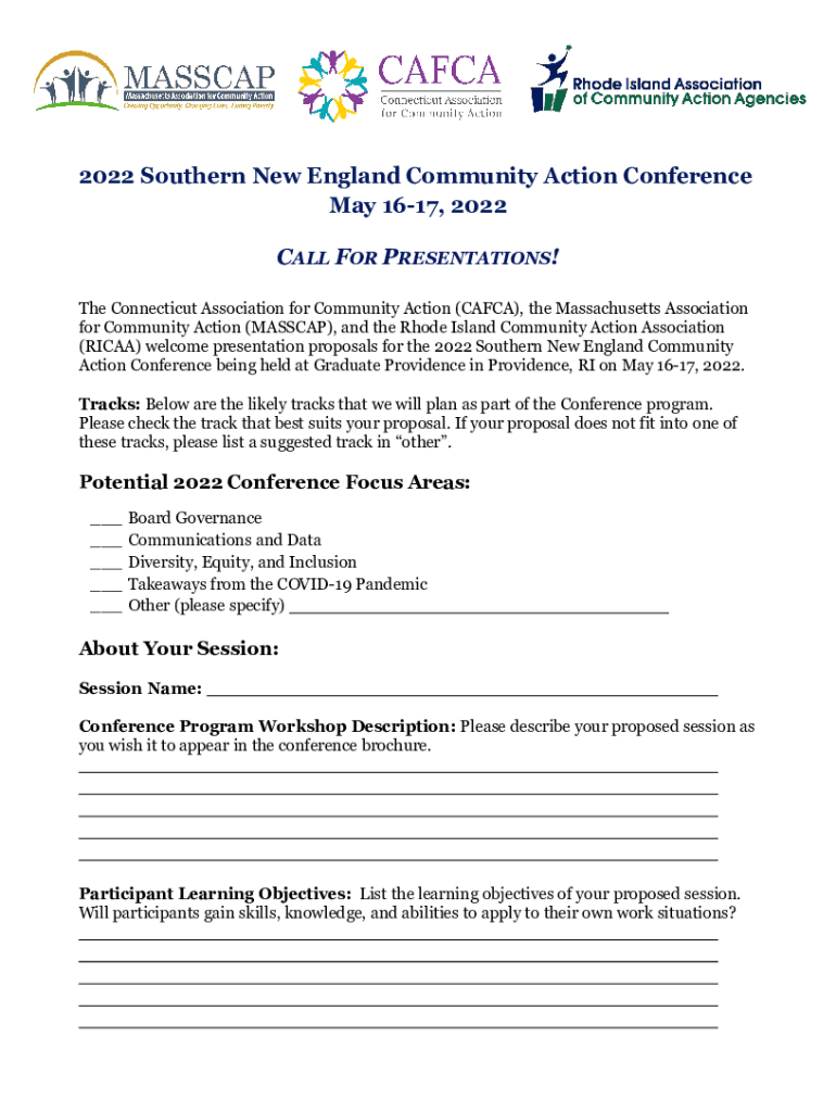 2022 Southern New England Community Action Conference May 1617, 2022 CALL FOR PRESENTATIONS! The Connecticut Association for Community Action (CAFCA), the Massachusetts Association for Community Action