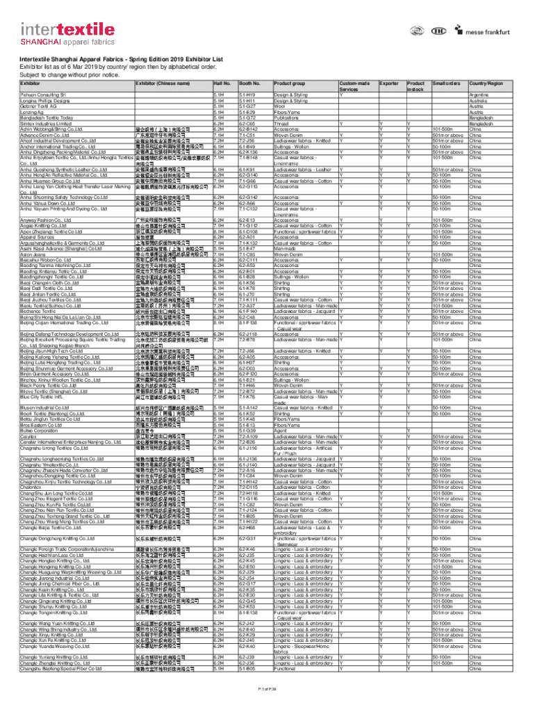 Intertextile Shanghai Apparel Fabrics Spring Edition 2019 Exhibitor List as of 6 Mar 2019 by country/ region then by alphabetical order.