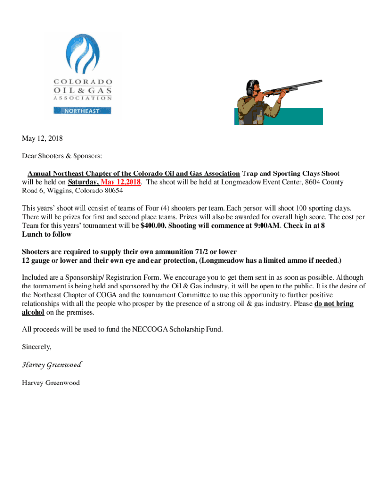 May 12, 2018, Dear Shooters & Sponsors: Annual Northeast Chapter of the Colorado Oil and Gas Association Trap and Sporting Clays Shoot will be held on Saturday, May 12, 2018. The shoot will be held