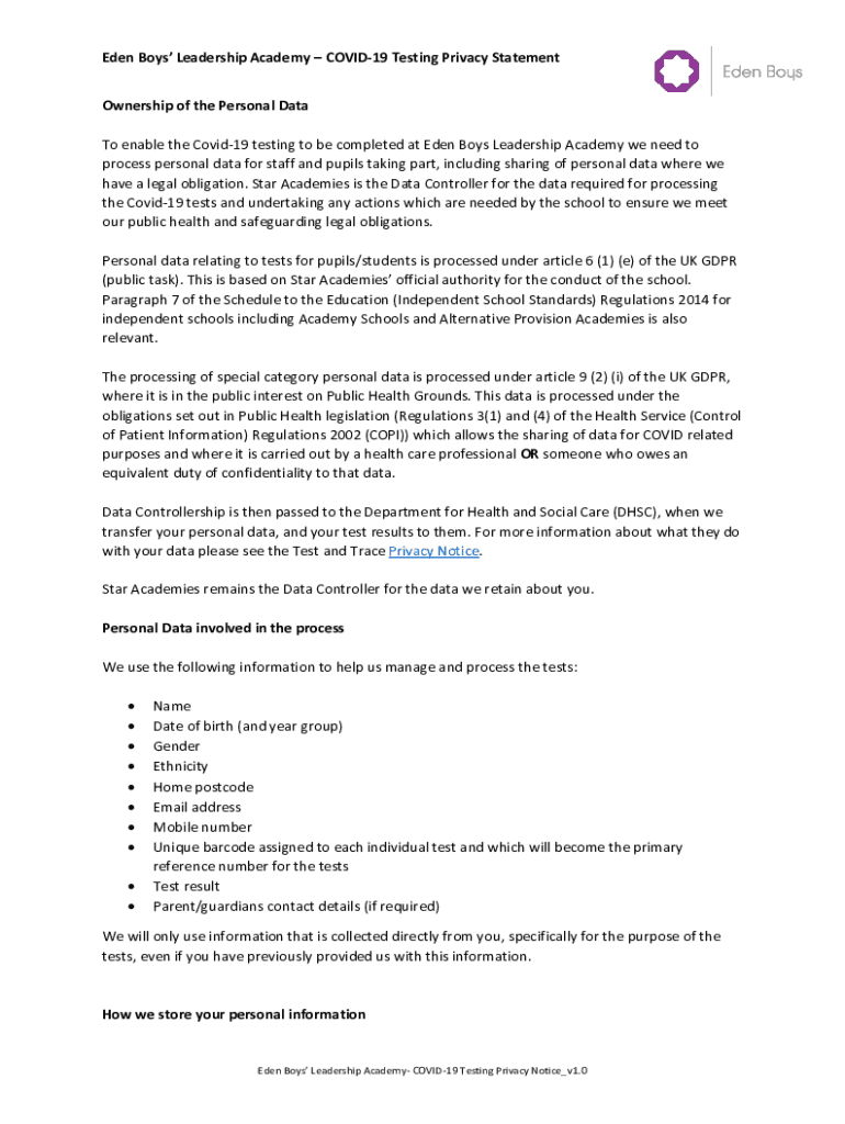 Eden Boys Leadership Academy COVID-19 Testing Privacy Statement