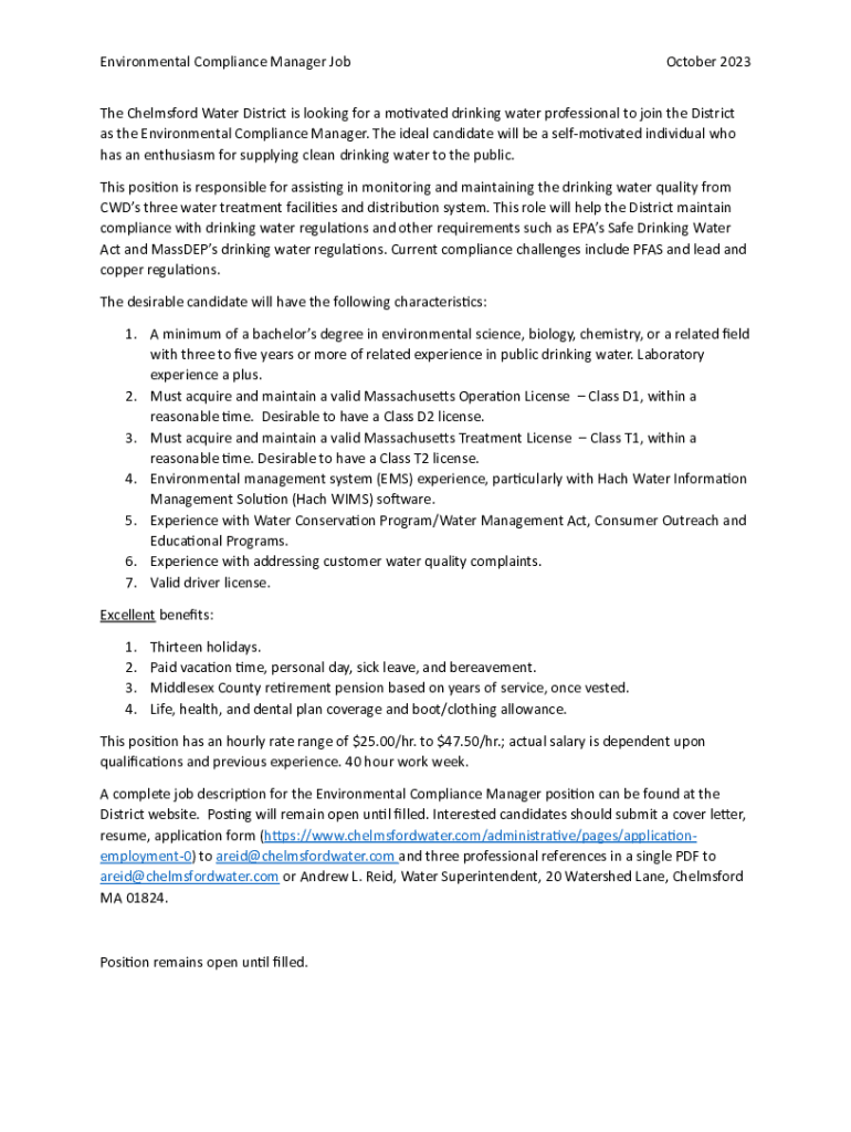 Environmental Compliance Manager Job October 2023The Chelmsford Water District is looking for a motivated drinking water professional to join the District