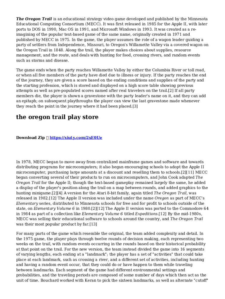 The Oregon Trail is an educational strategy video game developed and published by the Minnesota Educational Computing Consortium (MECC). It was first released in 1985 for the Apple II, with later
