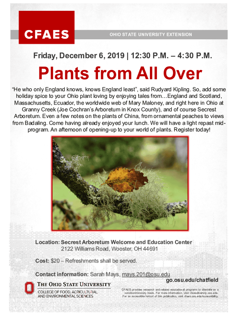 OHIO STATE UNIVERSITY EXTENSIONFriday, December 6, 2019 | 12:30 P.M. 4:30 P.M.Plants from All OverHe who only England knows, knows England least, said Rudyard Kipling. So, add some holiday spice to