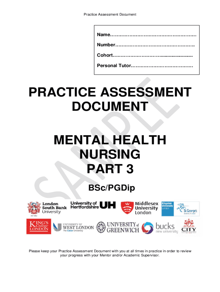 Practice Assessment DocumentName Number.. Cohort........................ Personal TutorPRACTICE ASSESSMENT DOCUMENT MENTAL HEALTH NURSING PART 3 BSc/PGDipPlease keep your Practice Assessment Document