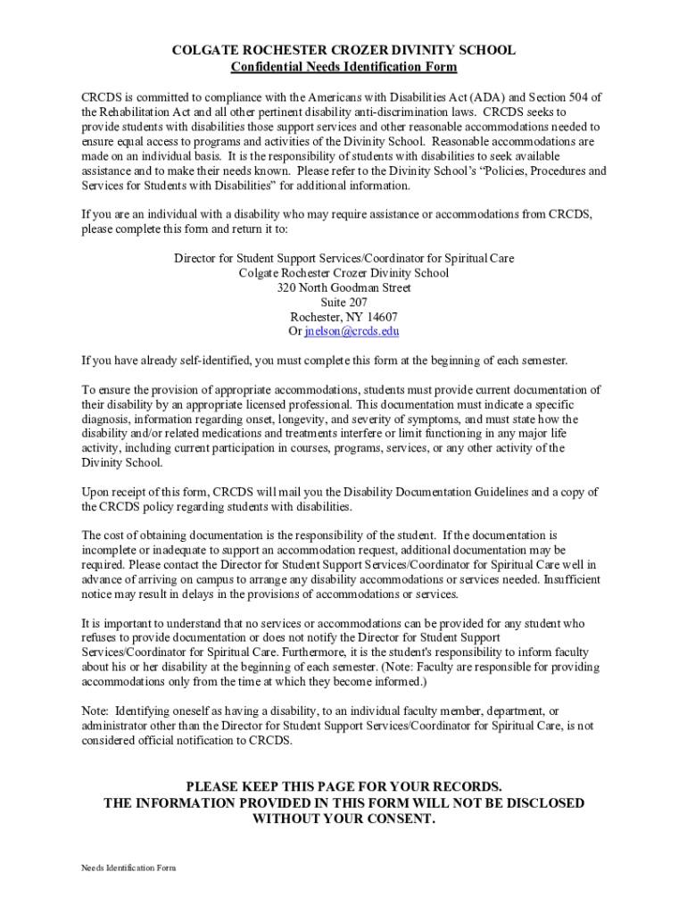 COLGATE ROCHESTER CROZER DIVINITY SCHOOL Confidential Needs Identification Form CRCDS is committed to compliance with the Americans with Disabilities Act (ADA) and Section 504 of the Rehabilitation