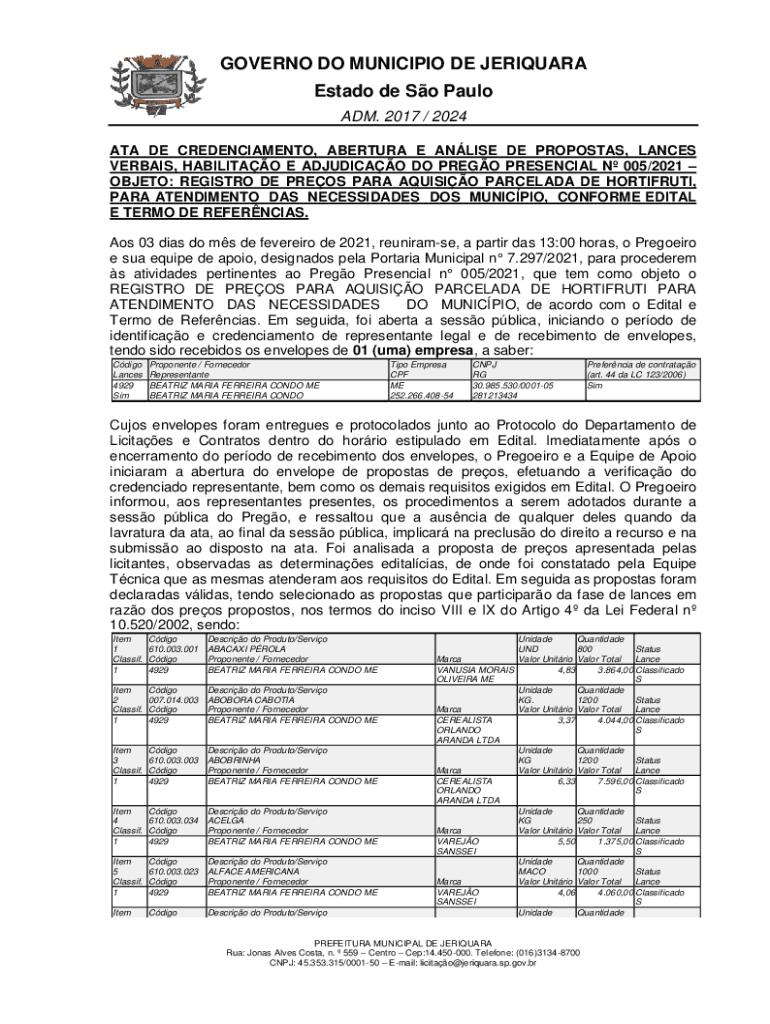 GOVERNO DO MUNICIPIO DE JERIQUARA Estado de So Paulo ADM. 2017 / 2024 ATA DE CREDENCIAMENTO, ABERTURA E ANLISE DE PROPOSTAS, LANCES VERBAIS, HABILITAO E ADJUDICAO DO PREGO PRESENCIAL N 005/2021 OBJETO: