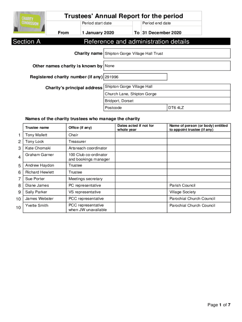 Trustees\' Annual Report for the period FromPeriod start datePeriod end date1 January 2020To 31 December 2020Section AReference and administration details Charity name Shipton Gorge Village Hall TrustOther