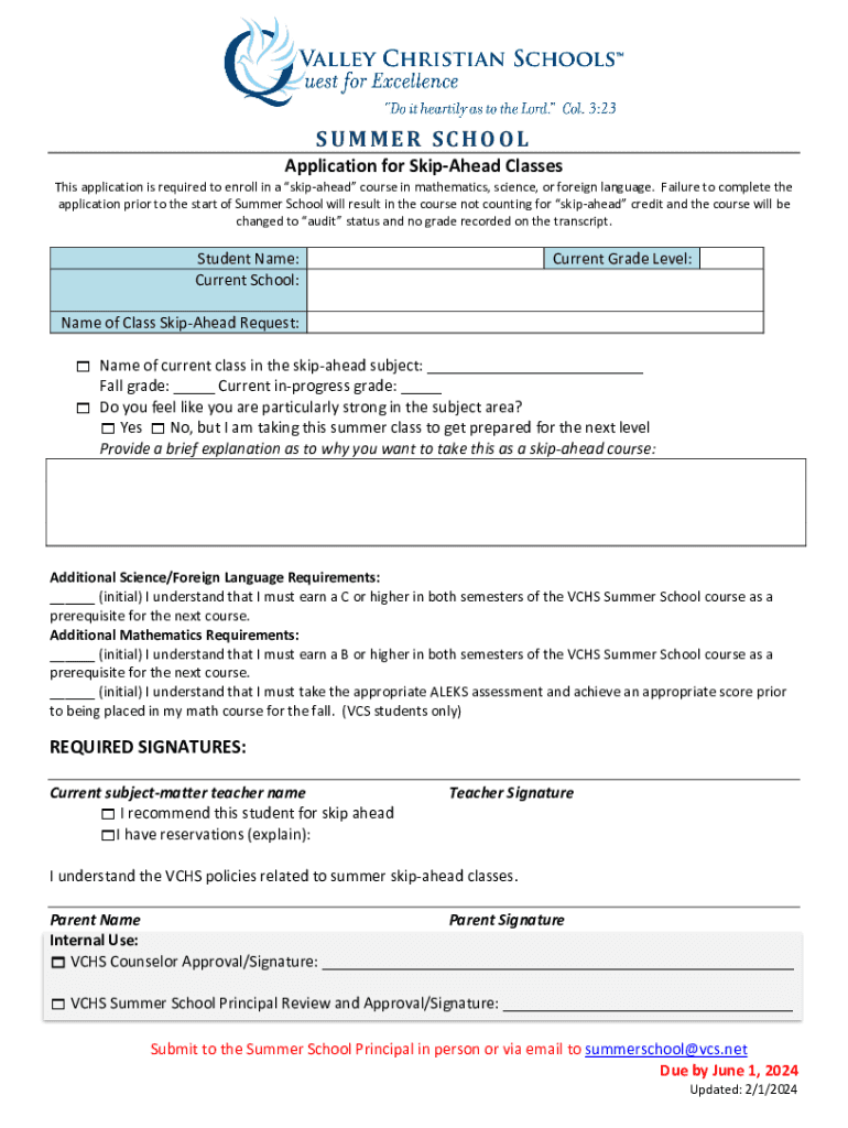 SUMMER SCHOOLApplicationforSkipAheadClasses Thisapplicationisrequiredtoenrollinaskipaheadcourseinmathematics,science,orforeignlanguage.Failuretocompletethe applicationpriortothestartofSummerSchoolwillresultinthecoursenotcountingforskipaheadcreditandthecoursewillbe