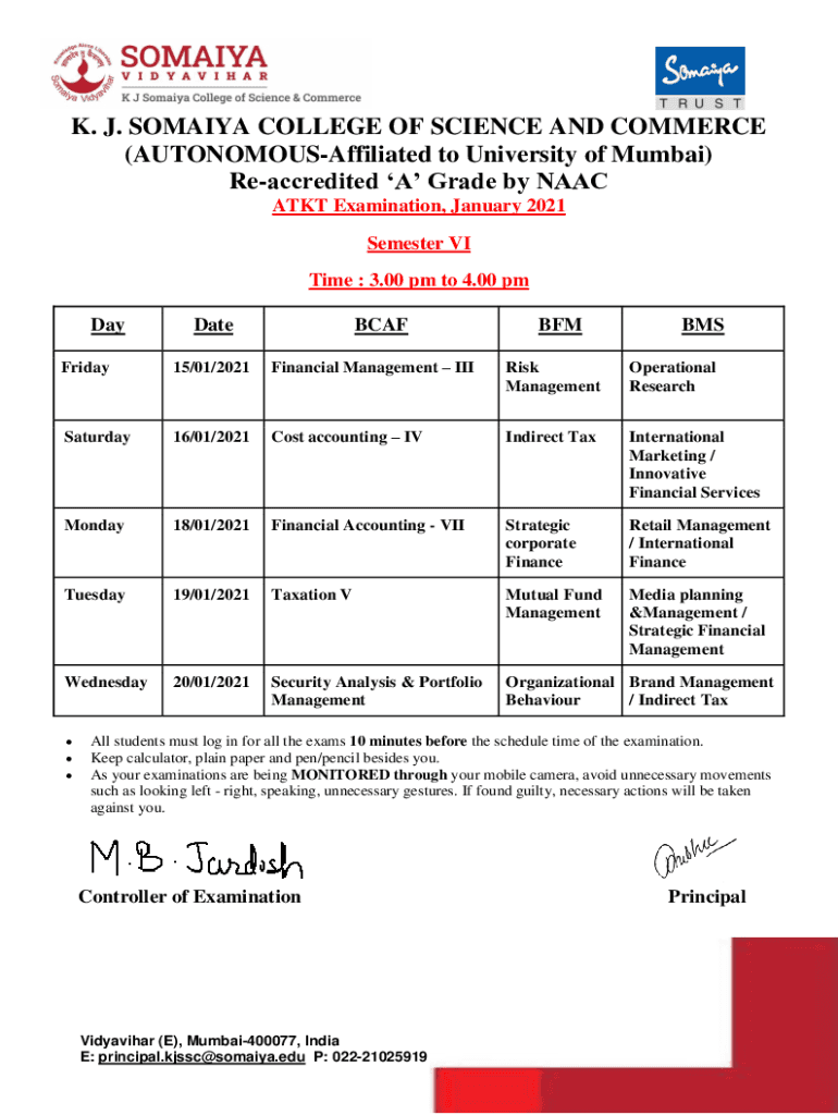 K. J. SOMAIYA COLLEGE OF SCIENCE AND COMMERCE (AUTONOMOUSAffiliated to University of Mumbai) Reaccredited A Grade by NAAC ATKT Examination, January 2021 Semester VI Time : 3.00 pm to 4.00 pm DayDateBCAFBFMBMSFriday15/01/2021Financial