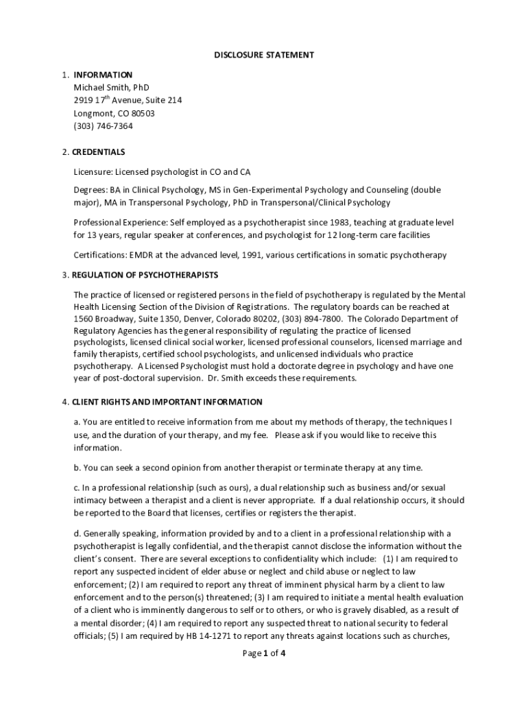 DISCLOSURE STATEMENT1. INFORMATION Michael Smith, PhD2919 17th Avenue, Suite 214Longmont, CO 80503(303) 74673642. CREDENTIALSLicensure: Licensed psychologist in CO and Degrees: BA in Clinical Psychology, MS in Experimental Psychology and Counseling (double