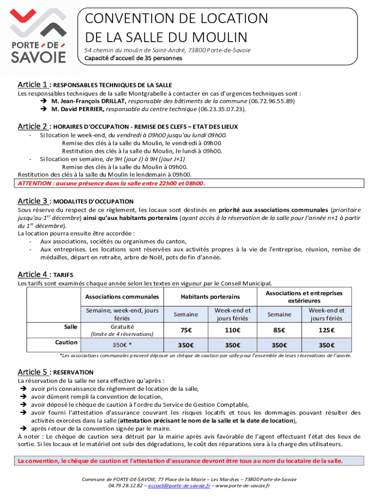 CONVENTION DE LOCATION DE LA SALLE DU MOULIN54 chemin du moulin de SaintAndr, 73800 PortedeSavoie Capacit daccueil de 35 personnesArticle 1 : RESPONSABLES TECHNIQUES DE LA SALLE Les responsables techniques