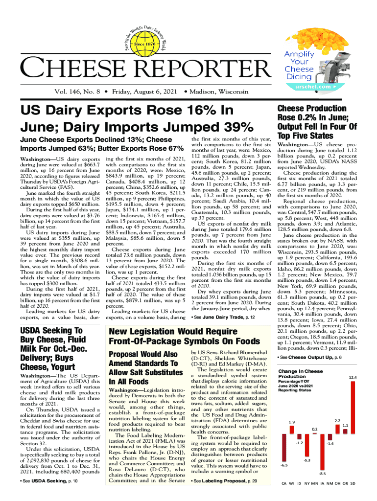 Serving theSince 1876ry Weekly ust\'s Dairy I nd orld WCHEESE REPORTER Vol. 146, No. 8 Friday, August 6, 2021 Madison, WisconsinUS Dairy Exports Rose 16% In June; Dairy Imports Jumped 39% June Cheese