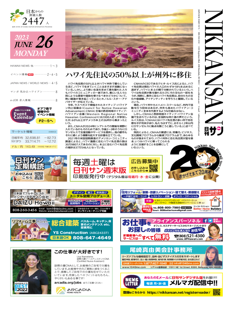 2447STATE OF HAWAII VISITOR INFORMATION PROGRAM202326JUNE MONDAYHAWAII NEWS .................1 3 NEW ..............245JAPAN NEWS / WORLD NEWS.... 45 ............. 8 eJOB .........................