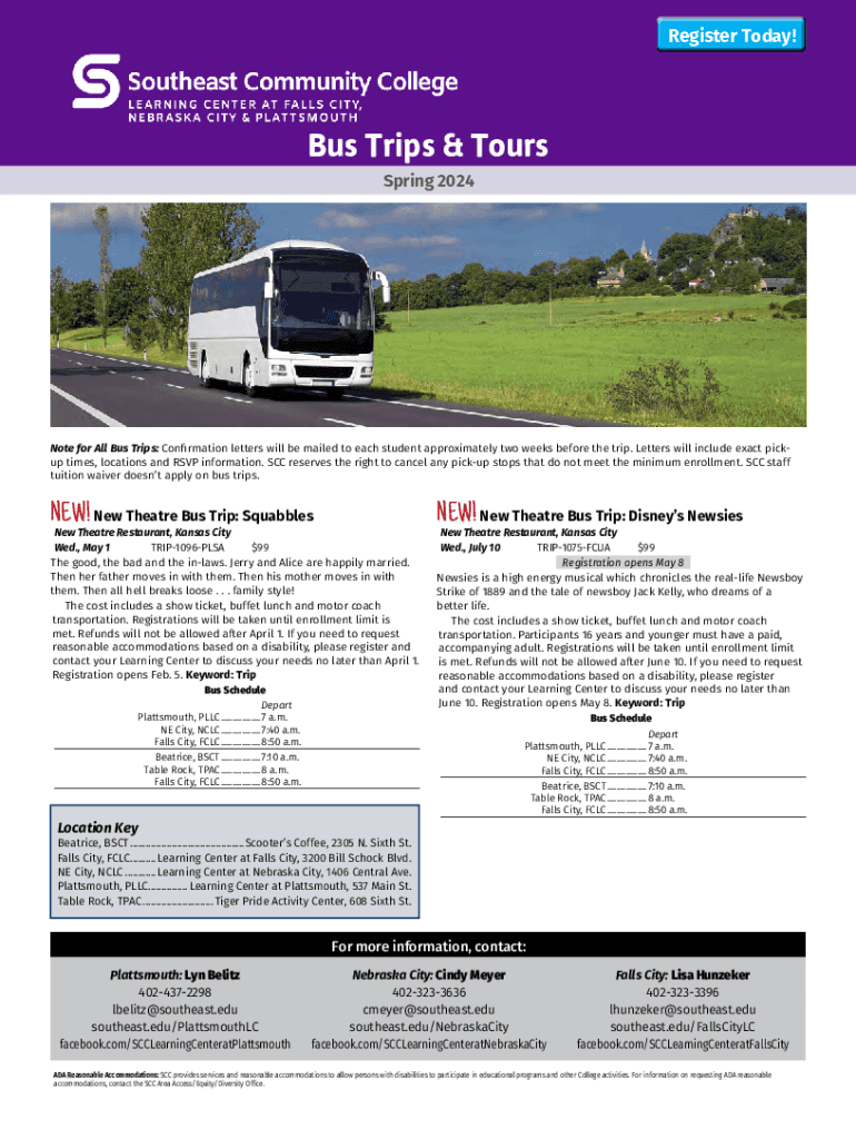 Register Today!Bus Trips & Tours Spring 2024Note for All Bus Trips: Confirmation letters will be mailed to each student approximately twoweeks before the trip. Letters will include exact pickup times,